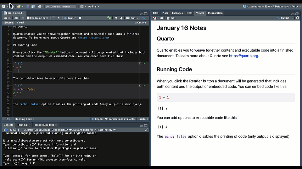 #| (hash-pipe) to add optionslabel is a unique identifier for the chunkecho controls whether the code is showneval controls whether the code is runmessage controls whether messages are shownwarning controls whether warnings are shown{r, echo = FALSE} ...05:00