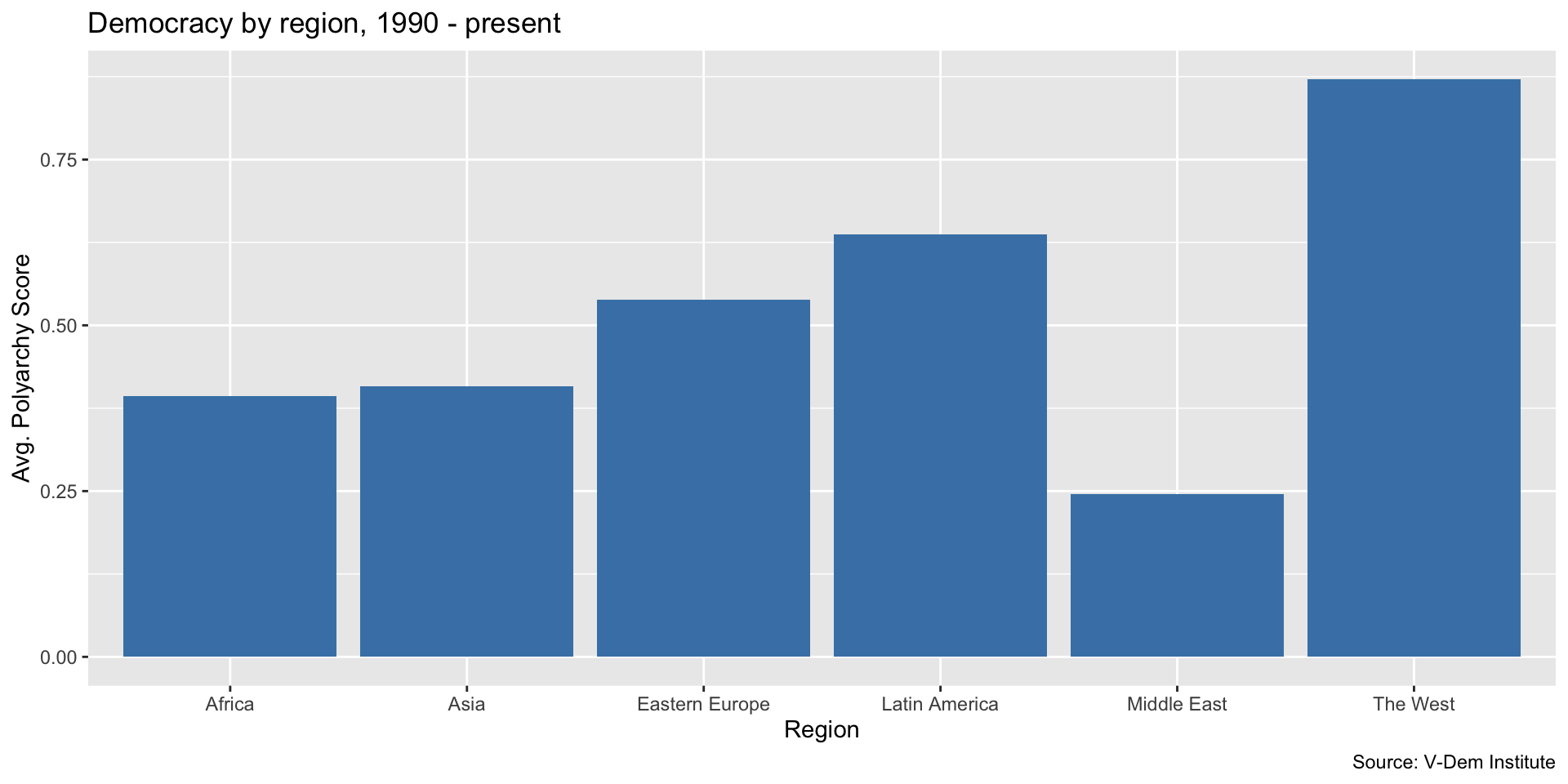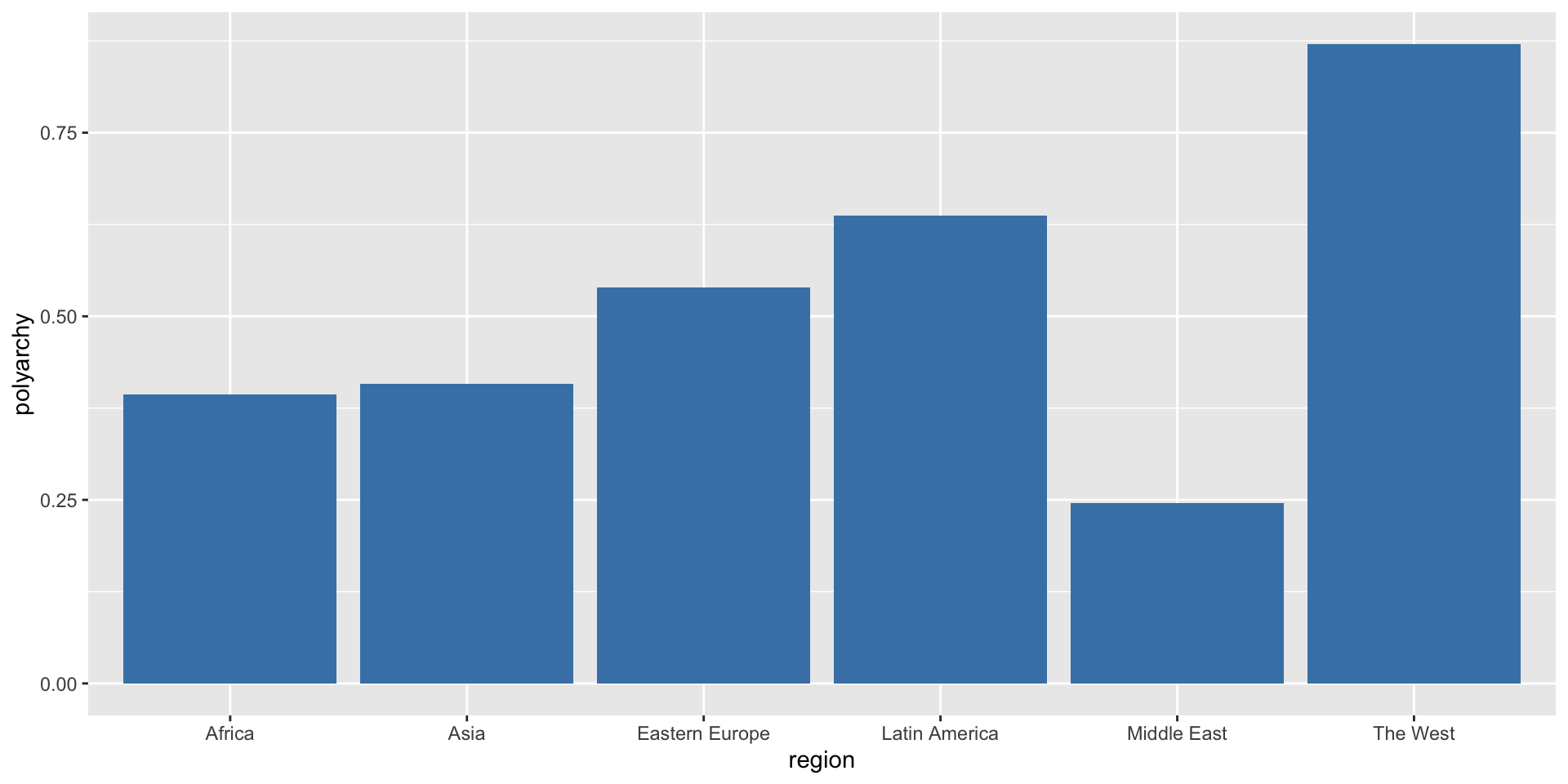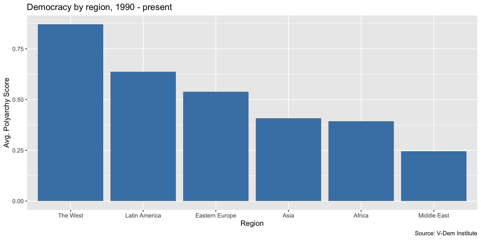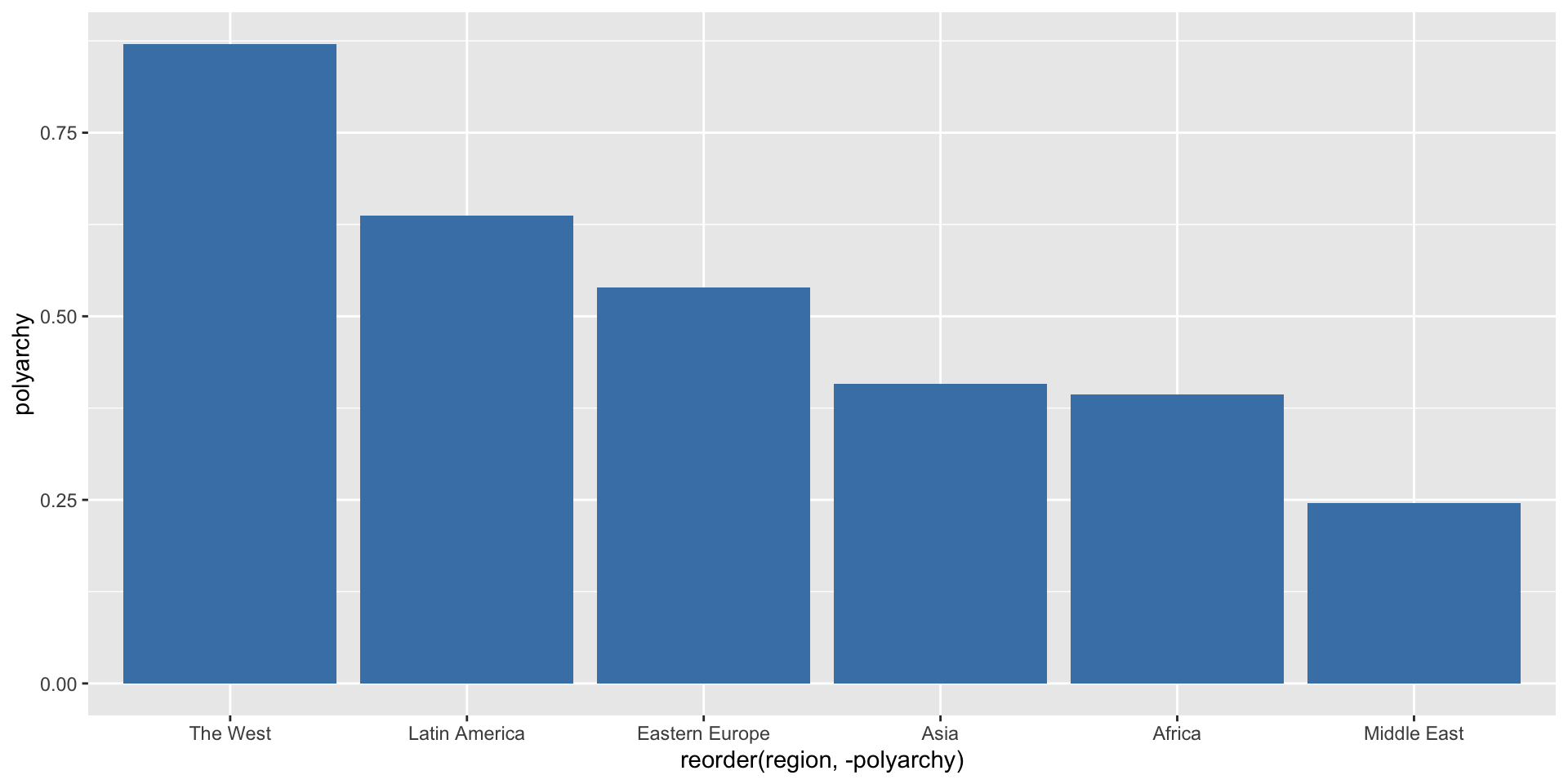 This way, we get a nice, visually appealing ordering of the bars according to levels of democracy…