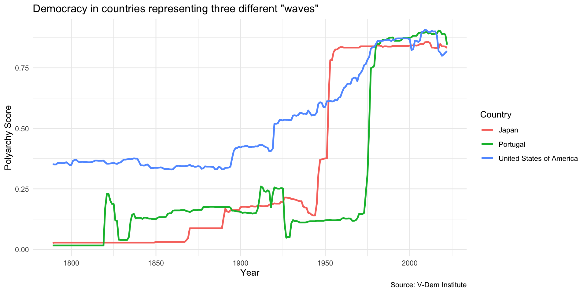 ggplot(dem_waves_ctrs, aes(x = year, y = polyarchy, color = country)) +