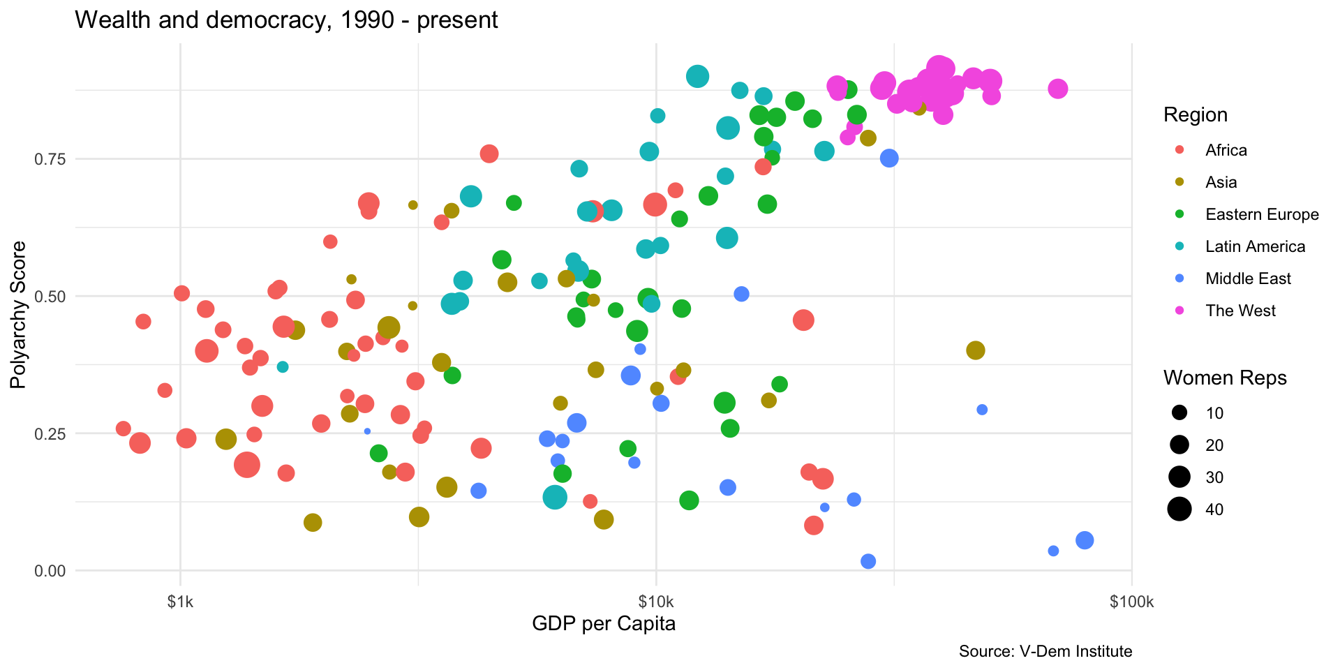 ggplot(dem_summary_ctry, aes(x = gdp_pc, y = polyarchy, color = region, size = women_rep)) +
