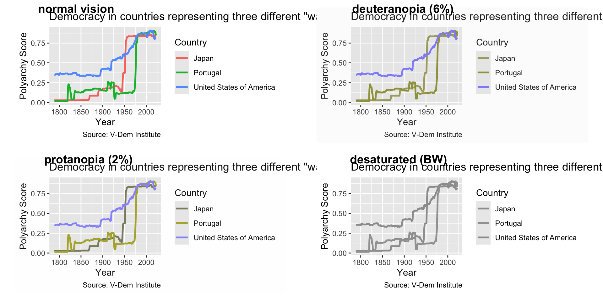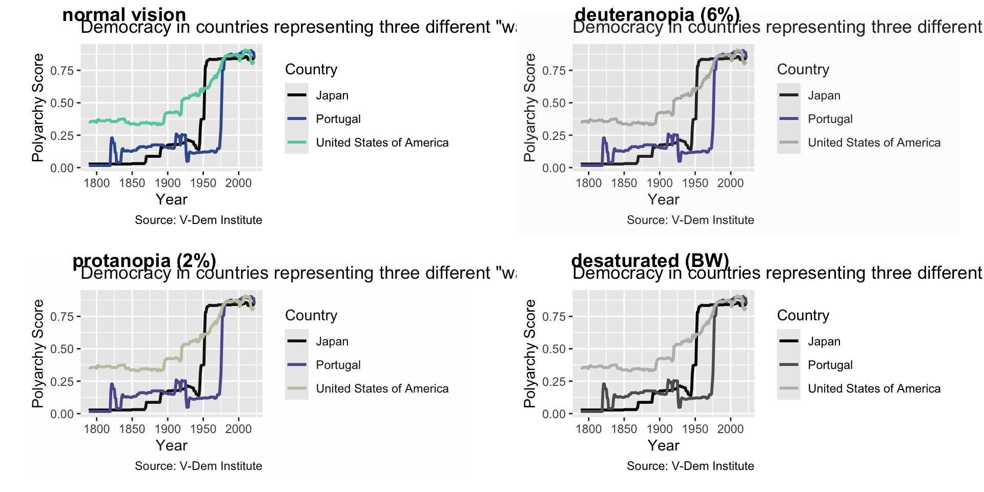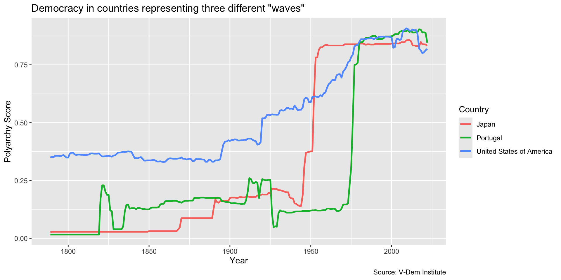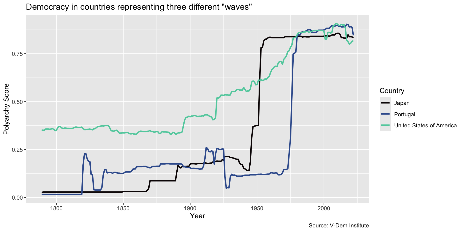 # in this ggplot() call, we add a third dimension for line colorggplot(dem_waves_ctrs, aes(x = year, y = polyarchy, color = country)) +geom_line(linewidth =1) +# our geom is a line with a width of 1labs(x ="Year", y ="Polyarchy Score", title ='Democracy in countries representing three different "waves"', caption ="Source: V-Dem Institute", color ="Country"# make title of legend to upper case ) +scale_color_viridis_d(option ="mako", end = .8) # use viridis color palette
