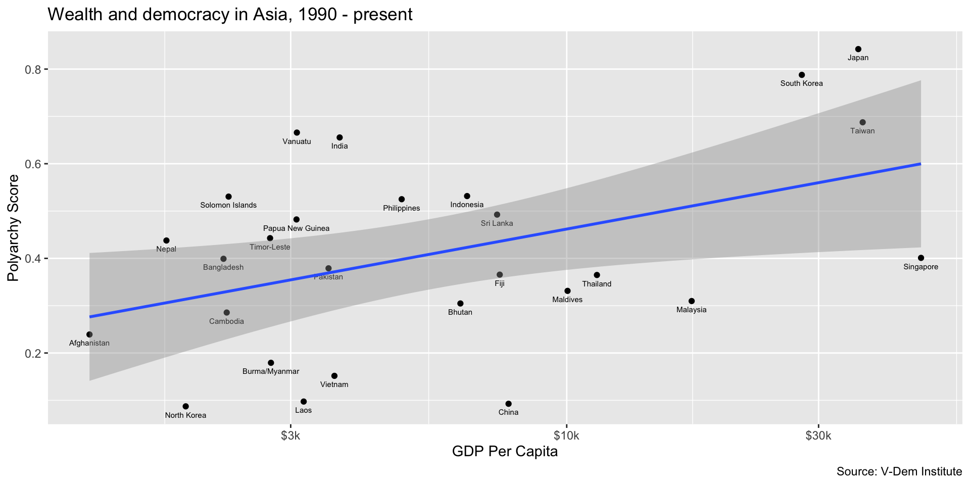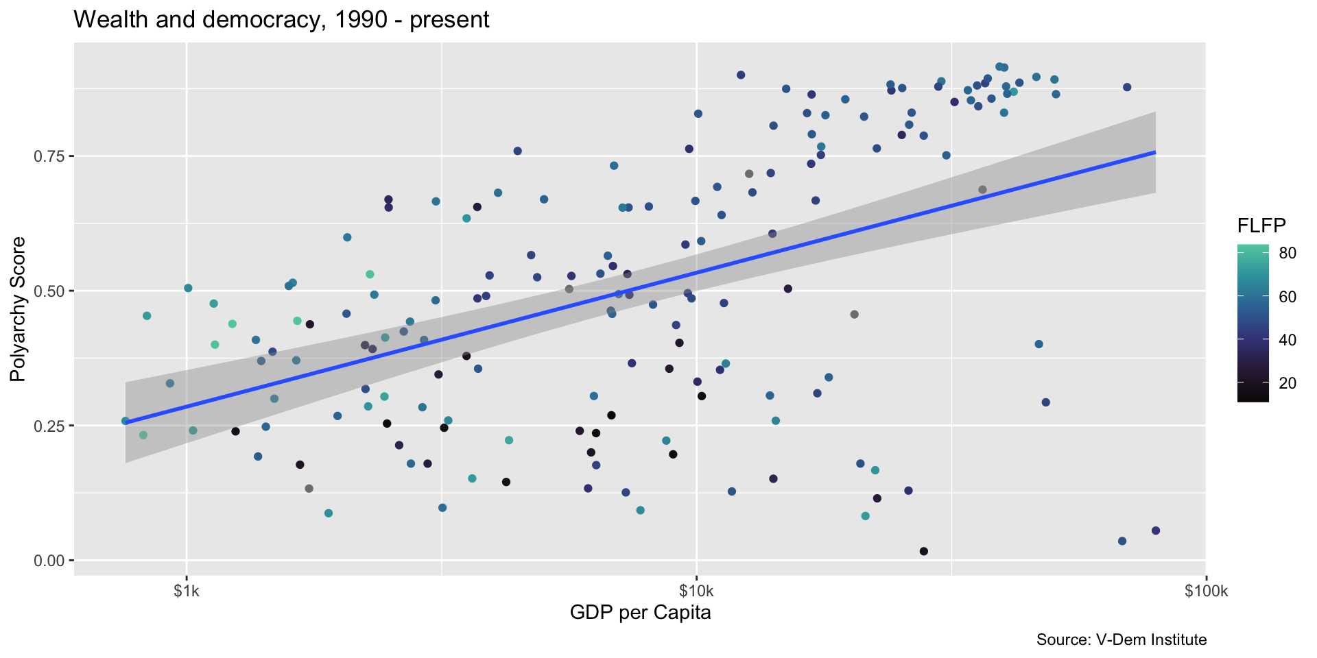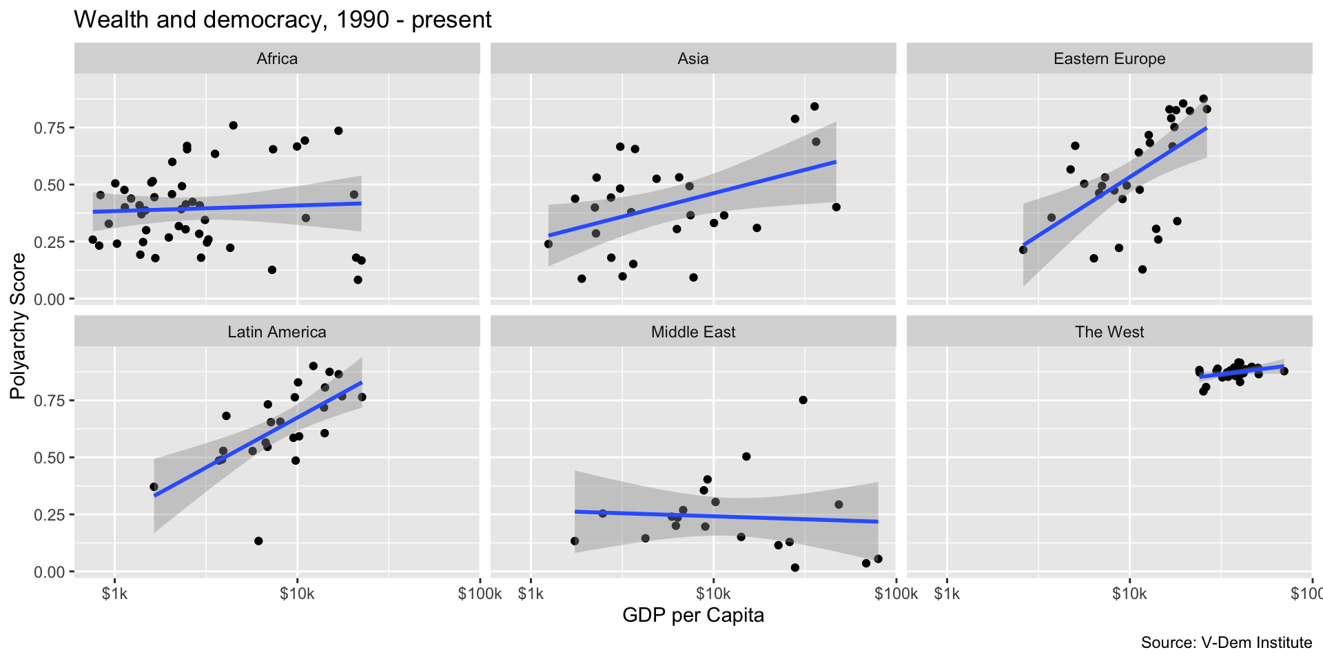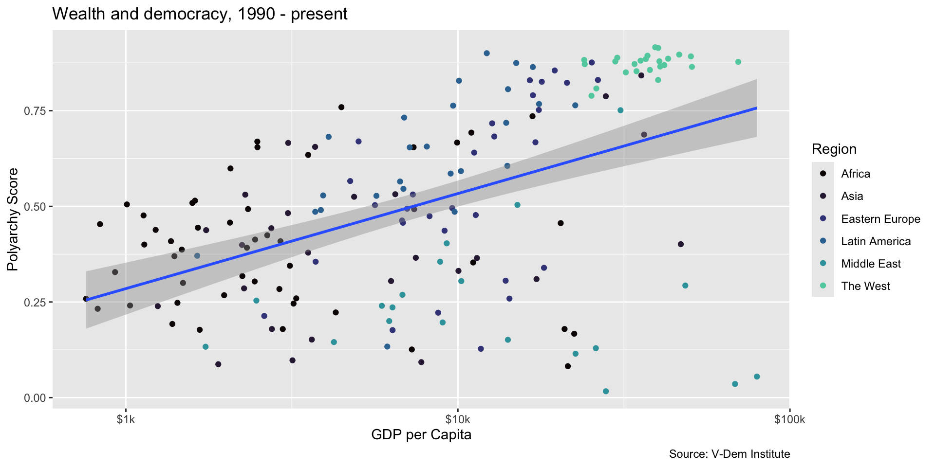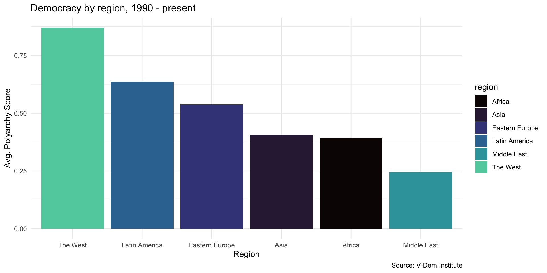 # in this ggplot() call, we add a third dimension for line colorggplot(dem_waves_ctrs, aes(x = year, y = polyarchy, color = country)) +geom_line(linewidth =1) +# our geom is a line with a width of 1labs(x ="Year", y ="Polyarchy Score", title ='Democracy in countries representing three different "waves"', caption ="Source: V-Dem Institute", color ="Country"# make title of legend to upper case ) +scale_color_viridis_d(option ="mako", end = .8) # use viridis color palette