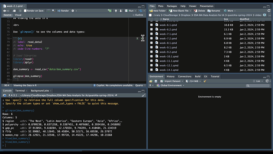 library(readr)install.packages("readr")Use glimpse() to see the columns and data types: